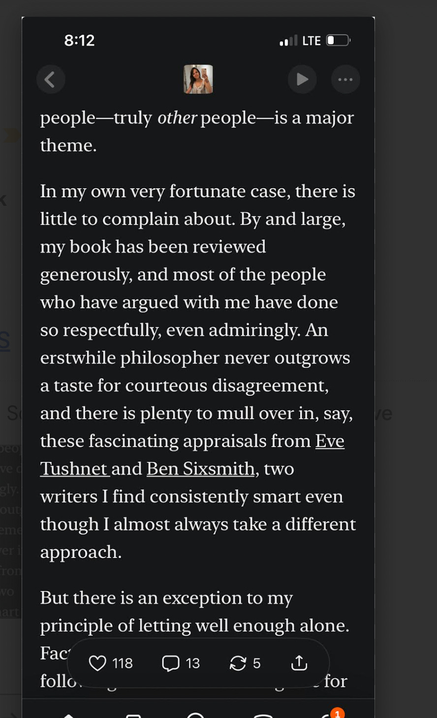 And here is book critic becca rothfeld, in a somewhat older post, noting that philosophers famously enjoy what she calls “courteous disagreement” (side note: there is a whole genre of essays/post/etc in which philosophers wonder if one reason their field skews so male is because of the adversarial nature of philosophy talks and panels and conferences—discourteous disagreement—where the standard mode is to respond to a talk by ripping into the speaker, trying to destroy him (sometimes her) in front of the audience, and how this is treated as good fun, even though this kind of verbal combat often feels hostile to people who historically don’t have power in public spaces):
