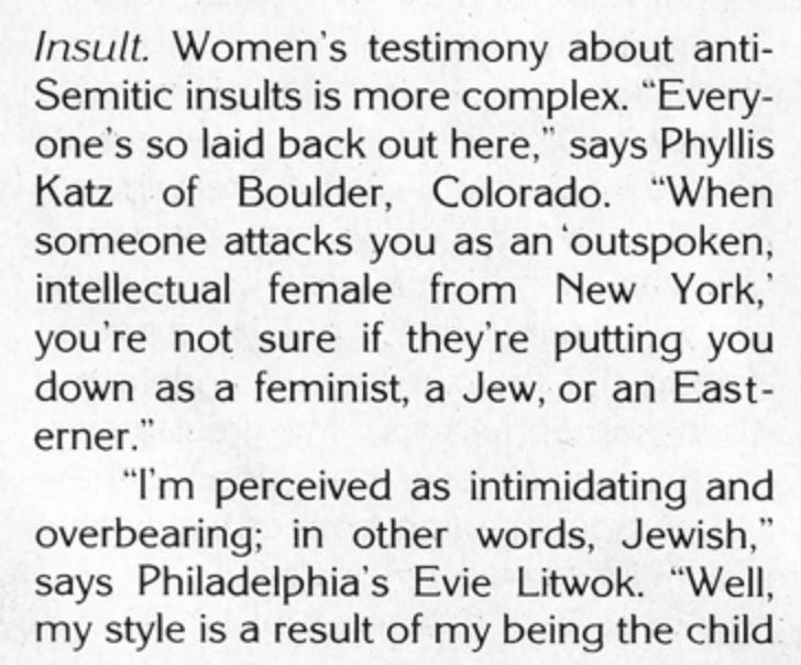 Here I’d like to refer to one of the classic essays of all time, “Anti-Semitism in the Women’s Movement,” written in Ms. in 1982 by (now-Substacker) Letty Cottin Pogrebin. Read the whole thing here. Here’s the important part: